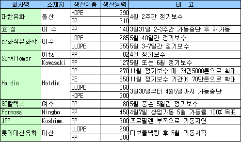 롯데 30만톤에 Formosa 45만톤 가동 … HPL은 하반기에 27만톤 보수 GS칼텍스가 여수 소재 PP(Polypropylene) 18만톤 플랜트를 5월 중순 5일간 정기보수할 계획이다.한화석유화학은 여수 소재 LDPE(Low-Density Polyethylene)와 LLDPE(Linear Low-Density PE) 플랜트의 정기보수를 각각 5월 한달간, 3-7일간 실시할 계획이며, 정기보수기간 동안 LDPE No.2 12만톤 플랜트의 생산능력을 4만2000톤 확대할 계획이다. 롯데대산유화는 디보틀넥킹을 완료하고 5월 LLDPE 29만톤과 PP 30만톤을 본격 가동할 계획이고, 대한유화는 울산 소재 HDPE(High-Density PE) 39만톤과 PP 31만톤 정기보수를 4월 2주간 실시한 것으로 알려졌다.