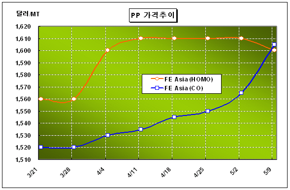 CFR FE Asia 1605달러로 30달러 올라 … 폴리미래 16만톤 가동중단 PP 가격은 5월 둘째 주 FOB Korea 톤당 1600-1610달러로 30달러 상승했다.아시아 PP(Polypropylene) 가격은 원료 프로필렌 가격이 초강세를 보이고 폴리미래가 16만톤 플랜트의 가동을 중단함에 따라 급등했다. 프로필렌 가격은 FOB Korea 톤당 1430-1440달러로 35달러 상승했다. 이에 따라 PP는 프로필렌과의 가격 스프레드가 170달러에 불과해 가공코스트 150달러를 고려하면 마진이 20달러에 불과한 것으로 분석되고 있다.