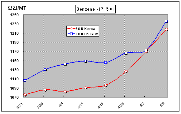 FOB Korea 1218-1219달러로 49달러 올라 … 미국은 1236달러로 폭등 벤젠 가격은 5월 둘째 주 FOB Korea 톤당 1219달러로 49달러 상승했다.아시아 벤젠(Benzene) 가격은 국제유가가 WTI(서부텍사스 중질유) 배럴당 126달러에 근접함에 따라 3주 연속 급등해 1220달러에 근접했다. 특히, 5월7일에는 FOB Korea 톤당 1222.50달러를 형성해 2004년 8월19일 이후 32개월만에 최고치를 기록했다.
