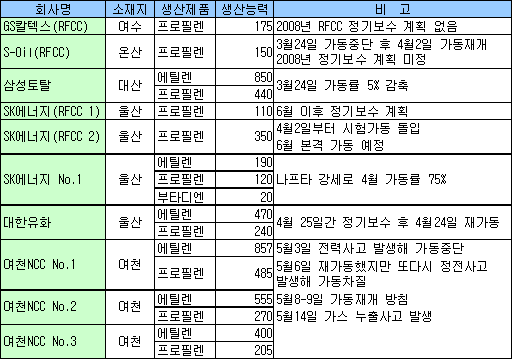 제조코스트가 가장 낮은 RFCC를 통한 프로필렌(Propylene) 35만톤을 시험가동에 들어가 6월부터 본격 가동할 전망이어서 SK에너지의 프로필렌 경쟁력이 한층 강화될 전망이다. 대한유화는 울산 소재 에틸렌(Ethylene)과 프로필렌 24만톤을 25일간 정기보수를 완료하고 4월24일 재가동에 돌입해 가동률 100%를 나타내고 있다. <이선애 기자> 표, 그래프: | 국내 올레핀 가동현황(2008) | <화학저널 2008/5/16> |