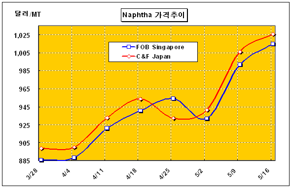 C&F Japan 1026달러로 20달러 상승 … 투기자금 유입 가능성 나프타 가격은 5월 셋째 주에 C&F Japan 톤당 1025-1026달러로 20달러 상승했다.아시아 나프타(Naphtha) 시장은 수급에 별 변화가 없었으나 유럽 가격이 상승한 영향을 받아 1000달러를 돌파했음에도 불구하고 강세를 지속했다. 유럽 가격이 1000달러에 육박했기 때문이다.