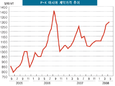 중국을 중심으로 여름철 의류 생산이 본격화함에 따라 Polyester 메이저들의 PTA(Purified Terephthalic Acid) 구매가 증가하고 있어 P-X 수급타이트를 견인하고 있기 때문이다. 특히, 유가 폭등, 석유제품 가격사승률 둔화 등으로 석유정제 마진이 악화돼 정유기업들이 감산을 강화함에 따라 부산물인 P-X 생산도 감소하고 있어 공급부족이 우려되고 있다. 여기에 인도네시아의 BTX 생산기업 TPPI(Trans-Pacific Petrochemical Indorama)가 불가항력을 선언하면서 수급타이트가 심화되고 있다. 한편, P-X Spot 가격은 5월16일 FOB Korea 톤당 1409달러로 1400달러를 돌파하는 등 ACP를 상회하고 있다. 표, 그래프: | P-X 아시아 계약가격 추이 | <화학저널 2008/5/20> |