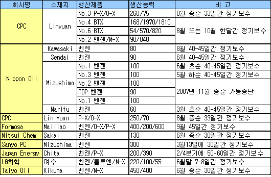 벤젠 22만톤에 톨루엔 10만톤 … 타이완과 일본도 가동중단 잇달아 LG화학이 6월 말 여수 소재 벤젠(Benzene) 22만톤과 톨루엔(Toluene) 10만톤, M-X(Mixed-Xylene) 5만5000톤 플랜트의 정기보수를 실시할 계획이다.여기에 타이완의 CPC 및 일본기업까지 정기보수를 대대적으로 실시할 계획이어서 2/4분기 아시아 BTX 시장의 수급타이트가 불가피할 전망이다. Taiyo Oil은 Kikuma 소재 벤젠 45만톤 및 M-X 40만톤을 6월 중순 30일간 계획하고 있고 Mitsui Chemical도 Sakai 소재 벤젠 13만톤을 6월 중순에 30일간 실시할 방침이다. Japan Energy는 Chita 소재 벤젠 20만톤과 P-X(Para-Xylene) 39만톤을 2/4분기에 50-60일간 실시할 계획이며 Sanyo PC는 Sakai 소재 벤젠 12만톤을 6월 중순 30일간 계획하고 있다.