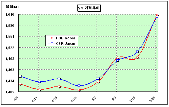 FOB Korea 1607-1608달러로 22달러 올라 … 중국 수요 활성화 SM(Styrene Monomer) 가격이 5월23일 중국 수요 활성화로 톤당 1600달러를 돌파했다.CFR China는 50달러 급등하며 톤당 1614-1615달러를 형성했고, FOB Korea는 22달러 올라 1607-1609달러를 나타냈다. 국제유가가 WTI(서부텍사스 중질유) 기준으로 배럴당 134달러를 돌파한 가운데 원료 벤젠(Benzene) 가격이 대폭 상승하고 있기 때문이다.