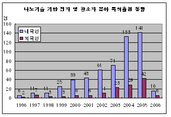 특허청, 199년대 후반부터 특허출원 급증 … 반도체산업 주도적 역할 나노(Nano)기술 기반 전자 및 광소자 특허출원이 급증하고 있는 것으로 나타났다.반도체 산업에서 나노기술은 나노입자, 나노선ㆍ박막의 어레이(Array) 및 이들 물질의 결합에 의한 나노 수준의 전자 및 광소자의 제조에 다양한 가능성을 열어줄 것으로 기대되고 있다. 특히, 나노입자와 나노선을 접합한 이종차원 하이브리드 나노소재는 나노입자의 정보 저장ㆍ생성의 장점과 나노선의 정보 전송의 장점을 접목시켰다.