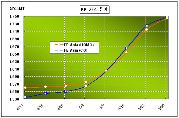 CFR FE Asia 1740-1750달러로 30달러 올라 … GS 18만톤 정기보수 PP 가격은 5월 다섯째 주 CFR FE Asia 톤당 1745달러로 30달러 상승했다.아시아 PP(Polypropylene) 가격은 원료 프로필렌(Propylene) 가격이 급상승한 영향을 받아 1700달러대 중반까지 오르면서 기염을 토했다. 나프타(Naphtha) 가격이 1100달러 수준으로 고공행진을 거듭하면서 나프타 크래커의 가동률이 낮아 프로필렌 가격이 FOB Korea 톤당 1550달러로 상승한 영향을 크게 받고 있다. 이에 따라 Raffia/Injection 및 BOPP 그레이드는 CFR FE Asia 톤당 1740-1750달러, Block Copolymer 그레이드는 1745-1750달러, IPP Film 그레이드는 1770-1780달러를 형성했다.