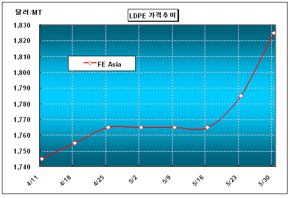 CFR FE Asia 1820-1830달러로 40달러 상승 … EVA는 2300달러 LDPE 가격은 5월 다섯째 주 CFR FE Asia 톤당 1825달러로 40달러 상승했다.LDPE(Low-Density Polyethylene) 가격은 아시아 수급 타이트가 장기화되고 EVA(Ethylene Vinyl Acetate)의 고공행진도 멈추지 않아 1800달러까지 돌파했다. EVA 가격은 CFR China 톤당 2300달러 이상으로 초강세를 지속해 LDPE/EVA 스윙 플랜트들이 EVA를 집중 생산하고 있기 때문이다.