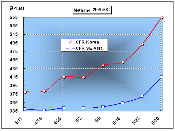 아시아 메탄올(Methanol) 가격은 중국의 Spot 가격이 이상급등한 영향을 받아 급등했고 중국가격은 CFR 570-580달러로 85달러까지 폭등했다.