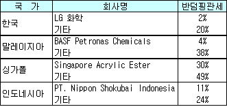 중국의 반덤핑관세율 2% 불과 영향 무 … 싱가폴ㆍ인도네시아는 타격 중국이 아크릴 에스테르(Acrylic Ester)에 대한 수입규제를 강화하고 있다.중국 상무부는 2003년 1-12월 수입제품을 대상으로 2007년 1-12월 덤핑조사를 실시한 결과 한국, 말레이지아, 싱가폴, 인도네시아산 아크릴 에스테르가 덤핑으로 수입됐다고 최종 확정하고 4월10일 반덤핑 최종판결을 내렸다. 이에 따라 싱가폴 및 인도네시아는 반덤핑관세율이 높아 중국 수출이 거의 불가능하게 됐다. 다만, LG화학은 2%, BASF Petronas Chemicals은 4%로 큰 타격을 입지 않을 것으로 예상되고 있다. 중국의 아크릴 에스테르에 대한 덤핑방지관세 부과기간은 2013년까지이다.