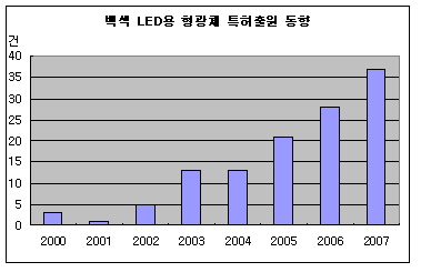특허청, 2005-07년 특허출원 86건 … 화학연구원 19건으로 최다 출원인 백색 LED(발광다이오드: Light Emitting Diode)가 차세대 광원으로 급부상하고 있는 가운데 형광체 기술개발이 활발한 것으로 나타났다.백색 LED는 발광다이오드와 형광체의 색을 혼합해 백색을 구현하는 장치로 자연광에 가까운 색을 재현할 수 있고 전력 소비량이 백열 전구와 형광등의 각각 10% 및 70% 정도에 불과하다. 백색 LED의 백색광은 일반적으로 청색 다이오드와 녹색ㆍ적색 형광체, 또는 청색 다이오드와 황색 형광체의 빛을 혼합해 구현되기 때문에 형광체의 광특성, 휘도 등에 의해 백색광의 색재현성이 결정될 정도로 형광체의 중요도가 큰 것으로 알려졌다.