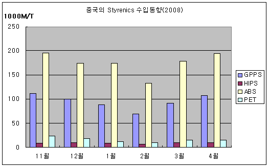 표, 그래프: | 중국의 Styrenics 수입동향(2008) | <화학저널 2008/6/12> |