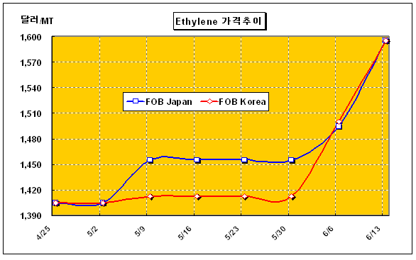 FOB Korea 1590-1600달러 형성 … 여천NCC 55만톤 크래커 가동중단 에틸렌 가격은 6월 둘째 주에 FOB Korea 톤당 1595달러로 95달러 상승했다.아시아 에틸렌(Ethylene) 가격은 원료 나프타 가격이 초강세를 지속하고 다운스트림 PE(Polyethylene)마저 폭등세를 계속한데 힘입어 1600달러에 육박했다. 중국의 Sinopec이 에틸렌 크래커의 가동률을 10% 감축하면서 PE 공급부족을 야기해 Film 그레이드 가격이 무려 100달러 폭등한 영향이 가장 컸다. 일부에서는 6월20일경에는 에틸렌 시세가 CFR NE Asia 톤당 1700달러 수준을 형성할 것으로 예상하고 있다.