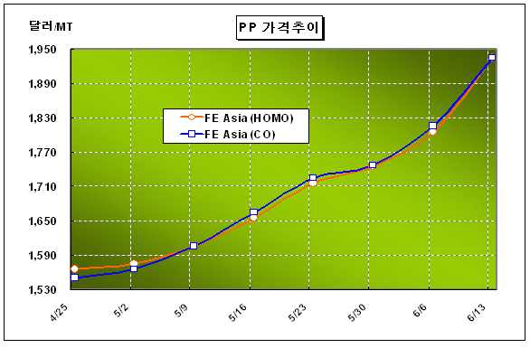 CFR FE Asia 1935달러로 130달러 폭등 … 중국 수급타이트 실체는? PP 가격은 6월 둘째 주에 CFR FE Asia 톤당 1930-1940달러로 130달러 상승했다.아시아 PP(Polypropylene) 가격은 원료 프로필렌 가격이 연일 급등하고 있는 상태에서 중국의 수급타이트가 심화되면서 1900달러를 훌쩍 넘어섰다. 중국에서는 Sinopec이 석유제품 공급을 확대하기 위해 에틸렌(Ethylene) 크래커의 가동률을 10% 낮추면서 PP 및 PE(Polyethylene) 생산도 줄어들어 내수가격이 급등하고 있다. 중국의 PP 내수가격은 ex-works 톤당 1만7000-1만7500위안으로 1000위안(144달러) 상승했다.