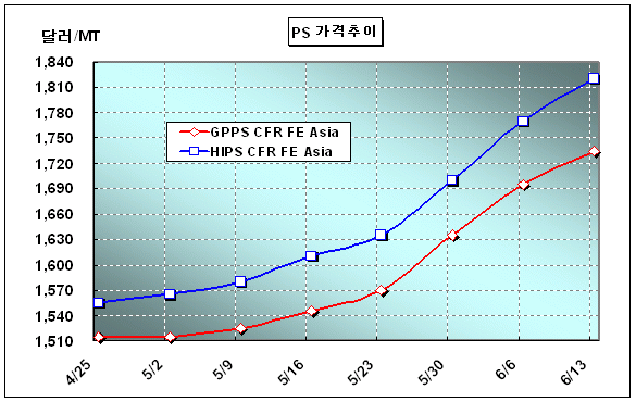 CFR FE Asia 1735달러로 40달러 상승 … 중국은 EPS 가동도 차질 GPPS 가격은 6월 둘째 주에 CFR FE Asia 톤당 1730-1740달러로 40달러 상승했다.아시아 PS(Polystyrene) 가격은 코스트 상승에 중국의 EPS(Expandable PS) 수요증가가 겹치면서 연속 상승해 1700달러를 넘어섰다. 중국이 쓰촨지역의 지진피해를 복구하기 위해 임시주택 150만채를 건설키로 결정하면서 EPS 수요가 급증하고 있기 때문이다. 이에 따라 GPPS(General Purpose PS)가 CFR FE Asia 톤당 1730-1740달러, HIPS(High-Impact PS)는 1815-1825달러로 상승했다.