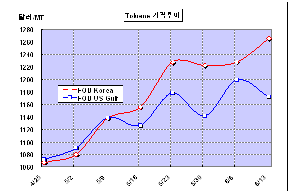 FOB Korea 1266달러로 38달러 상승 … 미국은 1172달러로 하락 톨루엔 가격은 6월 둘째 주에 FOB Korea 톤당 1266달러로 38달러 상승했다.아시아 톨루엔(Toluene) 가격은 역외물량이 곧 도착할 것이라는 예고에도 불구하고 전반적인 상승 분위기를 타고 1260달러를 넘어섰다. 그러나 Formosa가 미국제품 수입을 추진하고 있어 상승세는 제한되고 있다. Formosa가 수입하는 미국산은 8월 도착 예정이다.