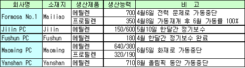 화재로 에틸렌 64만톤 가동중단 … Yanshan 크래커도 가동중단 예정 중국 Sinopec의 자회사 Maoming Petrochemical이 화재사고로 No.2 NCC(Naphtha Cracking Center) 가동을 중단한데 이어 Yanshan Petrochemical도 8월 올림픽 기간에 가동을 전면 중단할 계획어어서 주목되고 있다.Maoming의 No.2 크래커 화재는 6월3일 오후 6시55분경 발생해 7시50분경 진화됐는데 Sinopec은 석유화학 공장의 안전검사(Safety Inspections)를 위해 6월5일 Maoming 크래커를 모두 가동 중단시켰다. No.2 크래커의 에틸렌(Ethylene) 생산능력은 64만톤, 프로필렌(Propylene)은 32만톤이고, No.1 크래커는 에틸렌 38만톤, 프로필렌 19만톤으로 집계되고 있다. Yanshan 크래커는 71만톤의 에틸렌 생산능력을 보유하고 있는데 올림픽 기간동안 가동을 하지 않을 방침이어서 아시아 에틸렌 수급차질이 확대돼 가격폭등 장기화가 불가피할 전망이다.