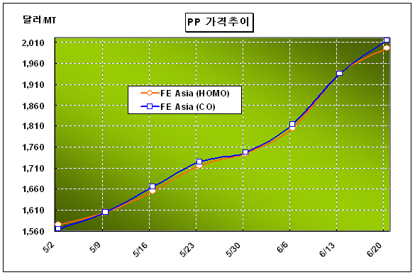 CFR FE Asia 1999-2000달러로 60달러 급등 … 화물연대 파업 직격탄 PP 가격은 6월 셋째 주에 CFR FE Asia 톤당 1995달러로 60달러 상승했다.아시아 PP(Polypropylene) 가격은 한국의 화물연대 파업으로 공급이 줄고 중국에서 쓰촨 대지진 및 홍수의 영향으로 수요가 증가하면서 상승세를 지속해 2000달러에 근접했다. 특히, 국내에서 화물연대가 6월13일부터 파업에 돌입하면서 17-18일부터는 폴리머 출하에 영향을 미쳐 초강세 요인으로 작용했다. 컨테이너 운송물량이 20% 수준으로 급감했기 때문이다.