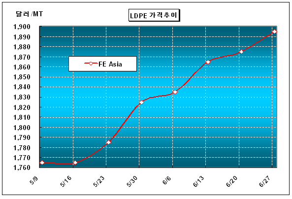 CFR FE Asia 1890-1900달러로 20달러 올라 … 한화 4만5000톤 증설 LDPE 가격은 6월 넷째 주에 CFR FE Asia 톤당 1895달러로 20달러 상승했다.LDPE(Low-Density Polyethylene) 시장은 중국 플랜트의 트러블에 따른 공급부족이 지속됨에 따라 1900달러 수준으로 상승세를 계속했다. 중국은 Maoming Petrochemical이 화재로 셧다운했던 에틸렌(Ethylene) 62만톤의 No.2 크래커를 재가동했으나 아직도 가동률이 50% 수준에 머물고 있다.