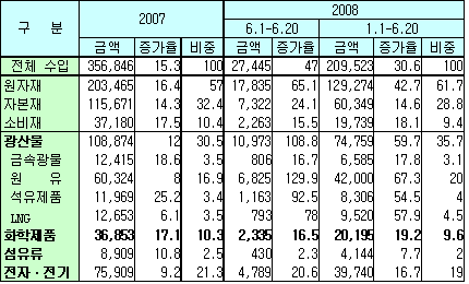 철근(112.1%), 철강판(58.8%) 등 철강제품(46.9%)과 알루미늄괴(7.3%), 동괴(3.8%) 등 비철금속제품(3.4%)의 수입이 증가했고, 유연탄(72.3%), 사료(49.2%), 의약품(23.0%), 펄프(16.6%), 금(14.7%) 등도 증가한 것으로 나타났다. 자본재(14.6%)는 무선통신부품(68.8%), 액정디바이스(40.0%), 휴대용컴퓨터(25.5%) 수입이 큰 폭으로 증가한 반면, 반도체 제조용 장비(23.1%), 공기조절기(10.1%), 소형직류전동기(5.6%) 수입은 감소했다. 소비재는 꾸준한 증가세(18.1%)로 농산물(42%)ㆍ승용차(29%) 등이 증가했다. 중국산 수입은 철강제품(55.2%), 액정디바이스(46.2%), 반도체(43.7%), 가정용전자제품(18.9%), 컴퓨터(16.4%), 섬유제품(5.8%) 등을 중심으로 증가했고, 일본제품은 자동차(36.4%), 철강제품(32.0%), 중전기기(28.1%), 정밀화학제품(21.4%), 반도체(10.7%) 등이 증가하고 반도체 제조용 장비(36.2%) 등은 감소했다. 미국산 수입은 철강제품(70.6%), 축산물(22.7%), 일반기계(8.6%), 비철금속제품(5.5%) 등이 증가하고, 반도체 제조용 장비(30.8%), 석유화학제품(20.6%), 반도체(14.1%) 등은 감소했다. EU 제품은 자동차(25.7%), 정밀화학제품(24.0%), 기초산업기계(20.5%), 전자부품(17.6%), 철강제품(9.7%) 등을 중심으로 수입이 증가했고 ASEAN 수입은 비철금속제품(88.8%), 농산물(58.4%), 섬유제품(33.2%), 반도체(20.7%), 금속광물(20.2%), 컴퓨터(3.7%) 등 대부분 품목이 증가한 것으로 나타났다. 표, 그래프: | 주요 품목의 수입동향(2008.H1) | <화학저널 2008/7/2> |