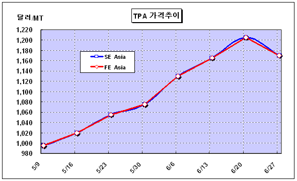 중국수요 둔화에 지나친 상승 견제심리로 … 7월 P-X ACP 1760달러 아시아 PTA(Purified Terephthalic Acid) 가격이 6월19일 CFR China 톤당 1200-1210달러를 나타내는 등 폭등한 후 6월27일 1165-1175달러로 35달러 하락했다.PTA는 원료 P-X(Para-Xylene) 강세로 13개월 만에 처음으로 MEG(Monoethylene Glycol)보다 높은 가격수준을 형성했는데, 6월27일에도 MEG 가격이 CFR China 톤당 1090달러로 급락해 여전히 높은 수준을 나타냈다. MEG의 1000달러 붕괴 가능성에 무게가 실리면서 PTA 시장에 호재로 작용하고 있고 아시아 PTA 플랜트의 가동률 상승이 예견되고 있다. 하지만, Nippon Oil을 비롯해 Idemitsu, ExxonMobil 등 아시아의 주요 P-X 메이저들은 7월 P-X 계약가격을 CFR Asia 톤당 1750-1770달러로 결정할 방침을 내비쳤다. 6월 ACP 1440달러 수준보다 무려 310-330달러 높은 수준으로 국내 PTA 생산기업들은 P-X 계약가격 결정시점을 지켜보고 있다.