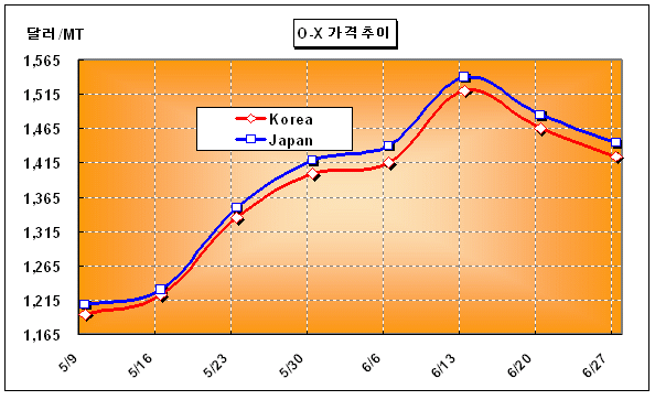 7월 하순 도착 예정인 O-X 2000톤은 무려 40-50달러 떨어져 CFR Zhangjiagang 톤당 1450달러에 판매된 것으로 나타났다.