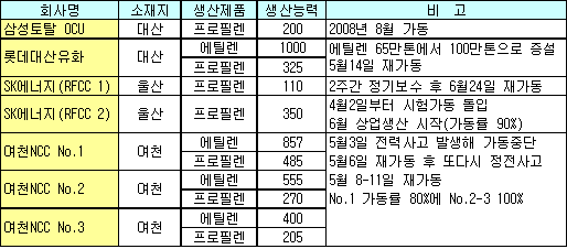 여천NCC 가동률 100% 회복 … 삼성토탈ㆍSK 프로필렌 증설 순조 SK에너지의 No.1 RFCC가 2주간의 정기보수를 마치고 6월24일 재가동에 들어갔으며 No.2 RFCC는 90%의 가동률을 나타내고 있다.SK에너지는 No.1 RFCC의 정기보수를 6월 이후까지 예정하고 있었으나 프로필렌(Propylene) 수급타이트에 따라 일정을 단축한 것으로 알려졌다. 롯데대산유화 역시 에틸렌(Ethylene) 35만톤 증설을 마치고 5월14일 재가동에 들어갔으며, 삼성토탈은 프로필렌 생산능력 20만톤의 OCU를 예정대로 8월 완공할 예정이다.
