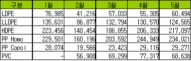 5월 LLDPE 이어 PVC도 12.2% 감소 … PVC는 재고 충분한 상태 중국의 폴리머(Polymer) 수입이 3월 이후 큰 변화 없이 안정된 모습을 띠고 있다.LDPE(Low-Density Polyethylene)는 2008년 1월 7만6985톤에서 2월 4만1216톤으로 감소한 후 3월 5만7033톤으로 증가했으나 4월 들어 5만5305톤으로 3.0% 감소한 후 5월 6만494톤으로 9.4% 증가했다. LLDPE(Linear Low-Density PE)는 2008년 1월 13만5631톤에서 2월 8만6877톤으로 35.9% 급감했으나 3월 13만2794톤으로 52.8% 폭증한 후 4월 13만0570톤, 5월 12만4565톤을 나타냈다. HDPE(High-Density PE)는 2008년 1월까지 증가한 후 2월 14만454톤으로 37.1% 급감했으나 3월 18만6855톤으로 33.0%, 4월 20만6333톤으로 10.4% 5월 5.2%로 상승세를 타고 있다.