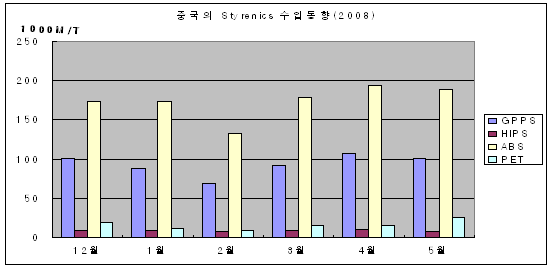 5월 GPPS 10만16542톤으로 5.9% 감소 … PET는 70.1% 폭증 2008년 들어 전반적으로 증가세를 이어가던 중국의 Styrenics 수입이 5월 감소세로 전환됐다.GPPS(General-Purpose Polystyrene) 수입은 2007년 12월 10만122톤으로 전월대비 10.3% 감소했고 1월 8만8116톤으로 11.9%, 2월 6만9586톤으로 21.0% 감소세를 지속했지만 3월 9만1381톤으로 31.3% 증가세로 전환된 후 4월에도 10만8051톤으로 18.2% 증가했지만 5월 10만1654톤으로 5.9% 감소한 것으로 나타났다. HIPS(High-Impact PS)도 12월 9585톤으로 11.6% 증가했지만 1월 8935톤으로 6.7%, 2월 6964톤으로 22.0% 감소세를 지속한 후 3월 9869톤으로 41.7% 폭증하면서 증가세로 전환된 후 4월 들어서도 1만453톤을 기록하면서 5.9% 증가했는데 5월에는 8403톤으로 19.6%의 마이너스로 전환됐다. ABS(Acrylonitrile Butadiene Styrene)도 12월 17만3696톤으로 11.5% 감소했고 1월 17만3677톤으로 0.1%, 2월 13만2563톤으로 23.6% 급감했지만 3월에는 17만8196톤이 수입돼 34.4% 증가한 후 4월 들어서도 9.1%의 증가율을 기록하면서 19만4471톤이 수입됐는데 5월에는 2.7% 감소율을 나타내면서 18만9185톤에 그쳤다.