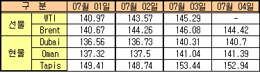 7월4일 0.39달러 올라 140.70달러 형성 … Brent는 1.66달러 하락 7월4일 두바이(Dubai)유 현물가격이 140달러 후반으로 상승했다.반면, 두바이유를 제외한 국제유가는 중동지역 지정학적 불안요인 완화의 영향으로 하락했다. 한국석유공사에 따르면, 런던석유거래소(ICE)의 Brent 선물유가는 전일대비 1.66달러 하락한 144.42달러에 거래를 마감했다. 뉴욕상업거래소(NYMEX)에서 거래되는 WTI(서부텍사스 경질유) 선물유가는 미국 독립기념일 휴장으로 입전되지 않았다. 두바이(Dubai)유 현물가격은 전일대비 0.39달러 상승해 140.70달러를 형성했다.