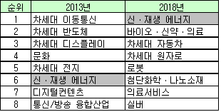 전경련, 4개 분야 기업의 신 성장동력 조사 … 바이오ㆍ신약ㆍ의료도 국내기업들은 10년 후 유망산업으로 신ㆍ재생 에너지, 바이오ㆍ신약ㆍ의료, 차세대 자동차 등을 꼽고 있으며, 개별 기업이 추진하고 있는 신 성장동력사업이 경쟁 해외 선진기업과 5년 이내의 격차가 있는 것으로 판단하는 것으로 나타났다.전국경제인연합회는 최근 에너지ㆍ환경, 신산업, 주력산업, 지식서비스 산업 등 4개 분야의 기업들을 대상으로 미래의 유망산업과 국내기업의 신 성장동력 발굴현황을 조사한 결과, 국내기업들은 2013년 유망한 산업으로 차세대 이동통신, 차세대 반도체, 차세대 디스플레이, 문화, 차세대 전지, 신ㆍ재생 에너지, 디지털컨텐츠, 통신ㆍ방송 융합산업 등을 꼽았으며, 2018년에는 신ㆍ재생 에너지, 바이오ㆍ신약ㆍ의료, 차세대 자동차, 차세대 원자로, 로봇, 첨단화학ㆍ나노소재, 의료, 실버산업 등을 유망산업으로 예상했다.