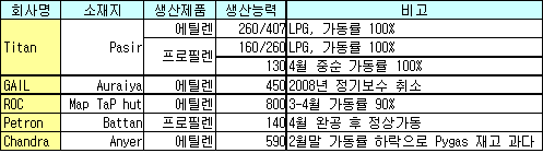 Titan은 크래커 원료 LPG로 대체 … Gail은 2008 정기보수 취소 2008년 3월 예기치 않게 가동률이 90% 이하로 떨어졌던 Titan의 Parsir Gudang 소재 크래커들이 가동률 100%를 회복한 것으로 알려졌다.Titan은 현재 LPG를 원료로 사용하고 있으며 에틸렌(Ethylene) 40만7000톤 및 26만톤 크래커의 가동률은 3월에, 프로필렌(Propylene) 13만톤 플랜트는 4월 중순 가동률 100%를 회복했다.