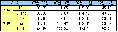 7월14일 0.02달러 내려 139.01달러 형성 … WTI 상승에 Brent는 하락 7월14일 두바이(Dubai)유 현물가격이 139달러 초반에서 소폭 하락했다.두바이유를 제외한 국제유가는 브라질 석유 근로자 파업 돌입에 따른 공급차질 우려로 상승했다. 한국석유공사에 따르면, 뉴욕상업거래소(NYMEX)에서 거래된 WTI(서부텍사스 경질유) 선물유가는 전일대비 0.10달러 상승한 145.18달러에, Brent 선물유가는 전일대비 0.57달러 하락한 143.92달러에 거래를 마감했다. 두바이유 현물가격은 전일대비 0.02달러 하락해 139.01달러를 형성했다.