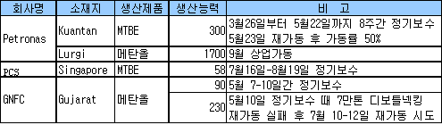 PCS는 MTBE 5만8000톤 플랜트를 7월16일부터 8월19일까지 정기보수할 계획이다. <오정현 기자> 표, 그래프: | 아시아의 MTBE 및 메탄올 가동현황 | <화학저널 2008/7/15> |