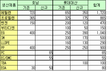 6월 대규모 신증설만 11개 … 합병으로 양질의 사업 포트폴리오 구비 호남석유화학과 롯데대산유화가 2009년 합병을 앞두고 6월 대산과 여수 플랜트 신증설을 완료해 일부 시운전에 들어가거나 본격적인 상업생산을 앞두고 있다.롯데그룹은 2014년 석유화학 매출 목표를 100억달러(약 10조원)로 잡고 호남석유화학과 롯데대산유화를 중심으로 국내외 자본투자를 확대하고 있다. 양질의 포트폴리오를 구축하게 된 호남석유화학은 신증설에 따라 국내 최대의 석유화학기업 도약을 기대하고 있다. 롯데대산유화는 에틸렌(Ethylene) 35만톤, 프로필렌(Propylene) 17만5000톤, 벤젠(Benzene) 12만톤, 부타디엔(Butadiene) 5만톤, SM(Styrene Monomer) 17만톤, EG(Ethylene Glycol) 39만톤, TBA(Tert-Butyl Acetate) 10만톤, PP(Polypropylene) 25만톤, LLDPE(Linear Low-Density Polyethylene) 13만톤을 증설했고, 호남석유화학은 EOA(Ethylene Oxide Additive) 5만톤, PC(Polycarbonate) 6만5000톤, DMC(Dimethyl Carbonate) 5만5000톤 증설을 완료했다.