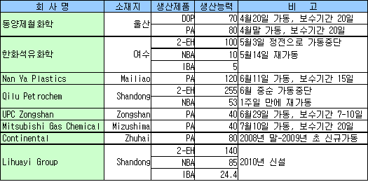 국내외 보수 차질없이 진행 … Continental과 Lihuayi는 플랜트 신설 아시아 Oxo-Alcohol 플랜트 가동이 전반적으로 순조로운 것으로 나타났다.동양제철화학은 4월20일 DOP(Dioctyl Phthalate) 7만톤 플랜트의 정기보수를 마치고 정상가동하고 있으며, PA(Phthalic Anhydride) 8만톤 플랜트 역시 정기보수를 마치고 4월말 가동에 들어갔다. 한화석유화학은 2-EH(Ethylhexanol) 10만톤, NBA(n-Butyl Alcohol) 1만톤, IBA(i-Butyl Alcohol) 5000톤 플랜트가 5월3일 정전사고로 가동하지 못했으나 5월14일 재가동에 들어갔다.