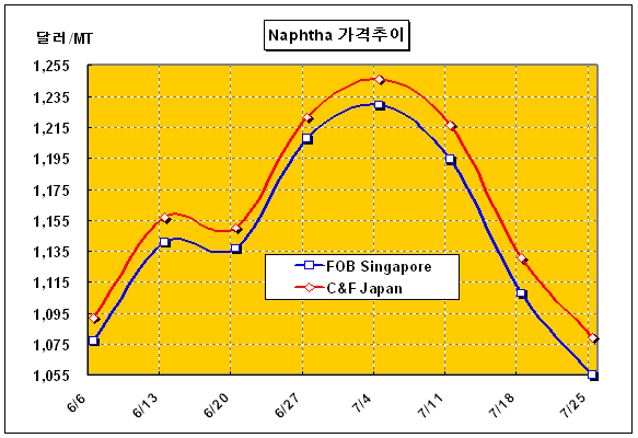 나프타 가격이 연속 폭락하고 있음에도 불구하고 대체재인 LPG의 코스트 경쟁력이 우위를 보이고 있는 점도 추가하락 요인으로 작용하고 있다. 한편, 유럽의 나프타 가격은 휘발유 첨가용 수요가 줄어들고 대체재인 LPG 수요가 여전히 호조를 보이면서 CIF NWE 톤당 1003달러로 하락했다. 표, 그래프: | Naphtha가격추이 | <화학저널 2008/7/28> |