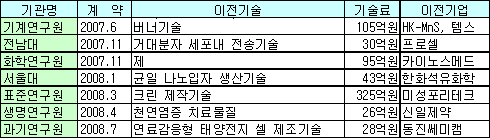 화학연구원, Gilead에 정액기술료 85억원 … 15년 런닝로열티 조건 한국화학연구원은 에이즈(AIDS)치료제 후보물질을 개발해 미국 제약메이저 Gilead Sciences에 기술을 이전했다.화학연구원은 기술이전으로 1차 기술료 10억원을 포함한 정액기술료 85억원, 2028년까지 매출에 따른 경상기술료(Running Royalty)를 받는 계약을 체결했다. 기관명계 약이전기술기술료이전기업기계연구원2007.6DPF(매연여과장치) 재생용 플라즈마 버너기술105억원HK-MnS, 템스전남대2007.11거대분자 세포내 전송기술30억원프로셀화학연구원2007.11당뇨병 치료제 후보물질 DPP-Ⅳ저해제95억원카이노스메드서울대2008.1균일 나노입자 생산기술43억원한화석유화학표준연구원2008.3촉각센서기반 초소형 마우스,터치스크린 제작기술325억원미성포리테크생명연구원2008.4천연염증 치료물질26억원신일제약과기연구원2008.7연료감응형 태양전지 셀 제조기술28억원동진쎄미캠대형 기술이전 사례에이즈치료제 후보물질은 화학연구원 손종찬 박사팀이 1998년 이후 지경부 등으로부터 22억원, 2006년부터는 Gilead와 5억4000만원을 투자해 공동 개발했으며 기존 치료제의 신경계통 부작용 및 유전적 독성을 최소화 할 수 있는 가능성을 확인해 1일 1회 투여의 편리성과 약효가 기대되고 있다.