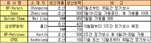 중국 110만톤 가동으로 아시아 공급과잉 심화 … VAM은 수급 조절 초산(Acetic Acid) 시장은 BP-Yaraco가 7월 초부터 35일간 일정으로 정기보수에 들어갔지만 나머지 플랜트들이 순조롭게 가동해 여전히 공급과잉 상태를 보이고 있다.삼성BP화학은 울산 소재 초산 42만톤 및 VAM(Vinyl Acetate Monomer) 15만톤 플랜트를 10월 말부터 3주간 정기보수할 예정이다. 상반기에 집중돼 있던 아시아 초산과 VAM 플랜트의 정기보수는 BP-Yaraco의 정기보수를 제외하고 모두 순조롭게 끝나 아시아 초산 공급에 탄력이 붙고 있다.