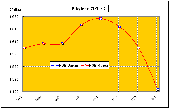 FOB Korea 1490-1500달러 형성 … 나프타 하락에 다운스트림 약세로 에틸렌 가격은 8월 첫째 주에 FOB Korea 톤당 1490-1500달러로 100달러 폭락했다.아시아 에틸렌(Ethylene) 가격은 국제유가의 하향 안정과 함께 나프타 및 다운스트림의 하락세가 겹치면서 100달러 폭락해 1500달러가 붕괴됐다. 이에 따라 8월 거래되는 Spot 2500톤이 CFR Taiwan 톤당 1490달러에 거래됐다. 동아시아에서는 에틸렌 생산기업들이 CFR 톤당 1500달러 이상을 요구하고 있는 반면, 수요기업들은 1420- 1430달러를 제시하는데 그치고 있다.