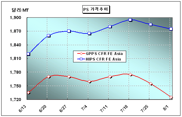 PS 가격은 8월 첫째 주에 CFR FE Asia 톤당 1725달러로 30달러 하락했다.