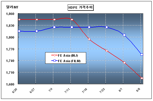 아시아 HDPE 가격도 Injection 및 Blow-Molding 그레이드가 1690-1700달러로 떨어진 것을 비롯해 Film 그레이드가 1750-1760달러, Yarn 그레이드가 1800-1810달러로 하락했다. 남미를 비롯한 해외에서도 아시아 가격이 추가 하락할 것으로 기대하면서 수입선을 전환하고 있는 것으로 알려지고 있다. 표, 그래프: | HDPE가격추이 | <화학저널 2008/8/11> |