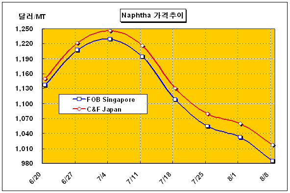 유럽 나프타 시장은 이미 공급과잉으로 전환됐으며, 휘발유 블렌딩용 수요도 저조해 당분간 하락세가 지속될 것으로 예상되고 있다. 아시아 가격이 5주 연속 급락함으로써 아시아 수출수요까지 줄어들고 있어 탈출구가 전혀 없어졌기 때문이다. 표, 그래프: | Naphtha가격추이 | <화학저널 2008/8/11> |