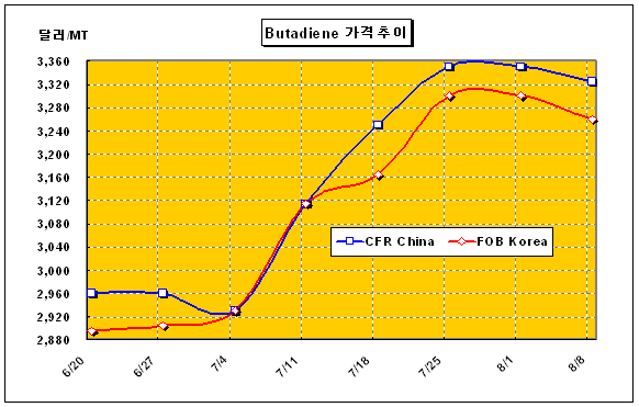 여천NCC는 8월3일 No.1 에틸렌 크래커의 가동을 중단했으나 부타디엔 플랜트는 100% 가동한 것으로 알려졌다. 중국의 부타디엔 내수가격은 ex-tank 톤당 2만7000-2만7500위안에서 2만6900위안(3290달러)으로 하락했다. 표, 그래프: | Butadiene가격추이 | <화학저널 2008/8/12> |