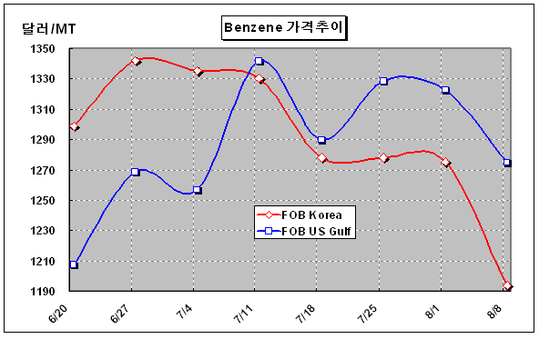 FOB Korea 1193-1194달러 형성 … 유도제품 가동률 50% 수준 감축 벤젠 가격은 8월 둘째 주에 FOB Korea 톤당 1194달러로 81달러 하락했다.아시아 벤젠(Benzene) 가격은 9월 공급과잉 예상으로 구매수요가 주춤한 가운데 공급은 넘쳐 80달러 이상 폭락하면서 1200달러가 무너졌다. 특히, 중국의 SM(Styrene Monomer) 수요가 크게 줄어들면서 아시아 시장 전체에 영향을 미쳐 폭락현상 지속이 우려되고 있다.