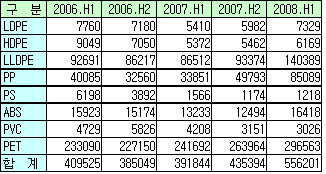 2008년 1-6월 42% 늘어 … 컴플렉스 사고 발생에 가격상승 석유화학제품 가격이 급등하고 있는 가운데 일본의 범용수지 수입이 급증하고 있다.일본의 2008년 1-6월 범용수지 8개 제품 수입은 55만6000톤으로 전년동기대비 무려 42%, 2007년 하반기 대비 28% 증가했다. Kagoshima 석유화학 컴비나트의 사고발생으로 가동이 중단돼 생산기업들이 급거 수입제품 조달에 힘썼기 때문이다. 범용수지 가격인상으로 수지가공 생산기업이 저가의 수입제품 사용을 확대한 것도 영향을 미쳤다. 7월 이후 일본의 범용수지 가격이 인상돼 수입이 한층 확대될 것으로 전망된다. 범용수지 8개 제품 수입은 6개월 단위기준 40만톤 안팎에서 움직였지만 2008년 상반기에는 일시에 55만톤을 돌파했다. 범용수지 중 수입량이 가장 많은 LLDPE(Linear Low-Density Polyethylene), PP(Polypropylene), PET (Polyethylene Terephthalate) 등 3개 제품이 큰 폭으로 증가했다.