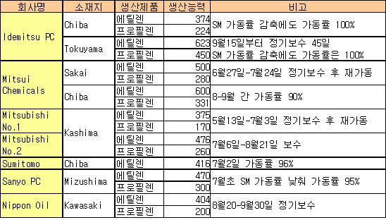 폴리머 위축에도 자가소비 변화 없어 … 2/4-3/4분기 정기보수로 일본 NCC(Naphtha Cracking Center)들이 2/4-3/4분기에 정기보수가 몰려 있어 비교적 높은 가동률을 유지하고 있다.아시아에서는 폴리머 가격 급락과 함께 바이어들이 기초유분 구매에 소극적인 태도를 유지하고 있어 전반적으로 가동률을 낮게 조정하고 있는 추세이다.