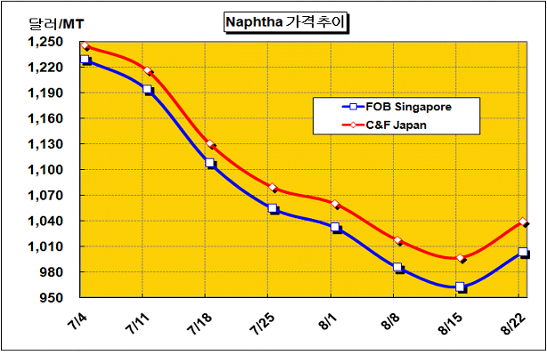 C&F Japan 1038-1041달러로 42달러 상승 … 유럽가격도 62달러 올라 나프타 가격은 8월 넷째 주에 C&F Japan 톤당 1039달러로 42달러 상승했다.아시아 나프타(Naphtah)가격은 중국을 비롯한 아시아의 수요 감소에도 불구하고 국제유가가 소폭 상승한 영향으로 다시 1000달러를 넘어섰다. 미국과 러시아의 갈등 고조의 영향으로 WTI(서부텍사스 경질유) 기준 국제유가가 배럴당 120달러를 상회했기 때문이다. 그러나 중국 정부가 베이징(Beijing) 올림픽 기간 동안 플랜트 가동을 억제하고 있고 일부 플랜트가 정전으로 가동을 중단해 또 다시 하락할 가능성도 배제할 수 없는 상황이다.