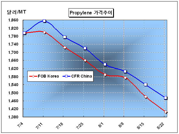 FOB Korea 1400-1410달러로 75달러 폭락 … 폴리미래 가동률 50% 프로필렌 가격은 8월 넷째 주에 FOB Korea 톤당 1405달러로 75달러 폭락했다.아시아 프로필렌(Propylene) 가격은 다운스트림 가동률 감축으로 재고가 싸여가는 가운데 구매수요가 저조해 공급과잉이 확대됨에 따라 6주 연속 폭락해 1400달러대까지 주저앉았다. PP(Polypropylene)를 비롯한 다운스트림 플랜트가 수익성 악화로 가동률을 낮추면서 프로필렌 재고가 넘쳐났기 때문이다.