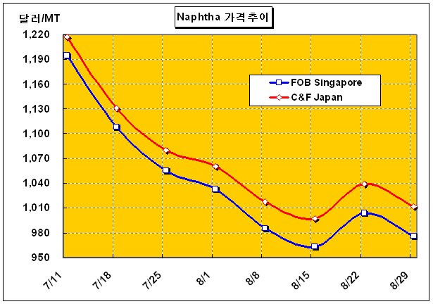 가솔린 블렌딩용 수요 증가에 힘입어 9월 스프레드가 배럴당 1달러 상승함에 따라 유럽과 아시아의 스프레드가 좁혀지고 아시아 시장의 하락장세가 장기화되면서 아시아 수출 가능성이 낮아졌기 때문이다. 다만, 나프타 가격이 하락세를 나타내고 있어 수요가 소폭 증가할 것으로 예상되고 있다. <이연숙 기자> 표, 그래프: | Naphtha가격추이 | <화학저널 2008/9/1> |