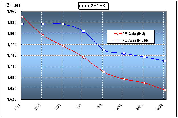 CFR FE Asia 1640-1650달러 형성 … Fomosa 35만톤 보수가 변수 HDPE 가격은 8월 다섯째 주에 1645달러로 20달러 하락했다.아시아 HDPE(High-Density Polyethylene) 가격은 중국 베이징(Beijing) 올림픽 폐막 효과에도 불구하고 구매수요가 저조해 7주 연속 하락함으로써 1650달러도 붕괴됐다. HDPE 최종수요처들이 국제유가가 하락함에 따라 HDPE는 물론 병산되는 LLDPE(Linear Low-Density PE) 가격이 추가 하락할 것을 기대하고 구매를 보류하고 있기 때문이다. 그러나 9월에는 구매수요가 회복될 것으로 보여 중국 내수가격이 Film 그레이드 기준 ex-works 톤당 1만3800-1만4000위안으로 250위안, 공급가격은 CFR China 톤당 1720-1770달러로 소폭 상승했다.